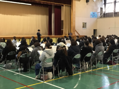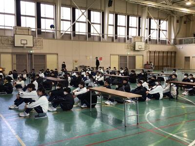 体育館では、保護者の方々が中学校の生活や部活動についての説明を真剣な面持ちで聞いていらっしゃいました。